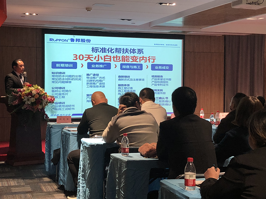 常務副總陳飛用了近90分鐘為大家全面而深刻的解析了防水修繕市場的背景、現狀和市場機遇,且就當前的舊建筑物防水修繕闡明了我們的“三化”服務模式——產品專業(yè)化、施工標準化、售后保障化。報告了魯邦防水修繕服務中心三年的發(fā)展規(guī)劃,涵蓋技術研發(fā)、市場服務團隊、施工技術團隊及魯邦防水修繕服務中心覆蓋縣城達到1000家。